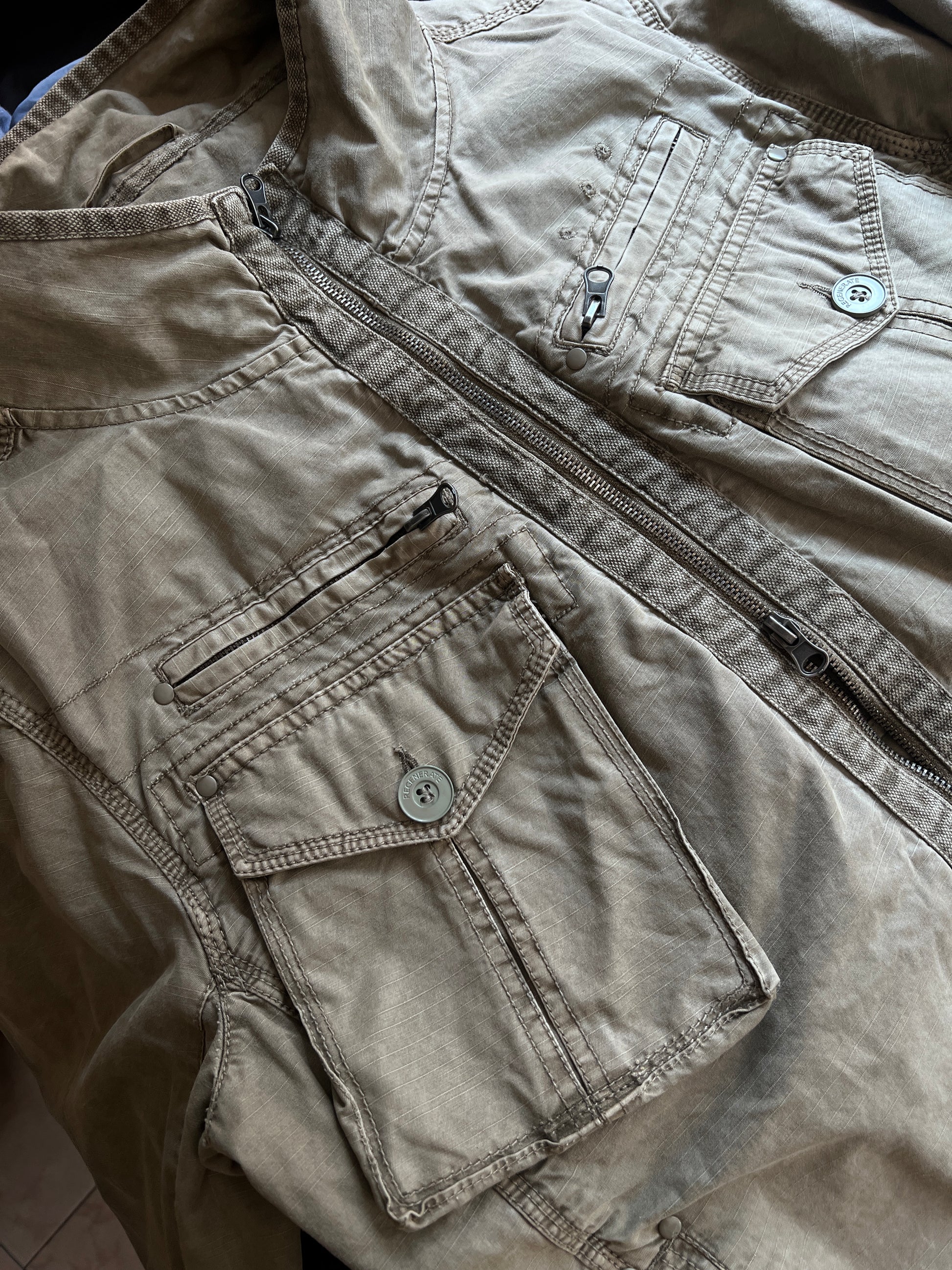 Jacket militar, material de tela resistente, múltiples bolsillos.